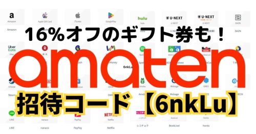 招待コード「6nkLu」を入力してギフト券の購入または出品を行うと、取引額の5%(最大250ポイント)がアマテンポイントとして還元されます。