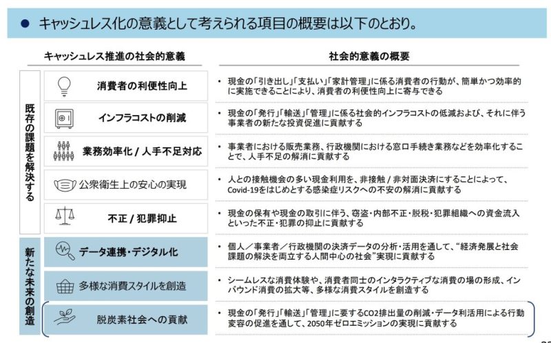 ・現金の「発行」「輸送」「管理」に係る社会的インフラコストの任減および、それに伴う事業者の新たな投資促進に貢献する