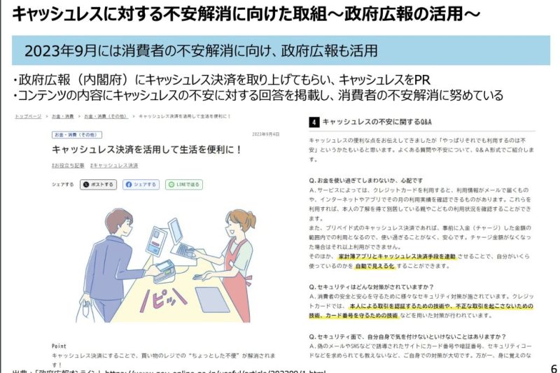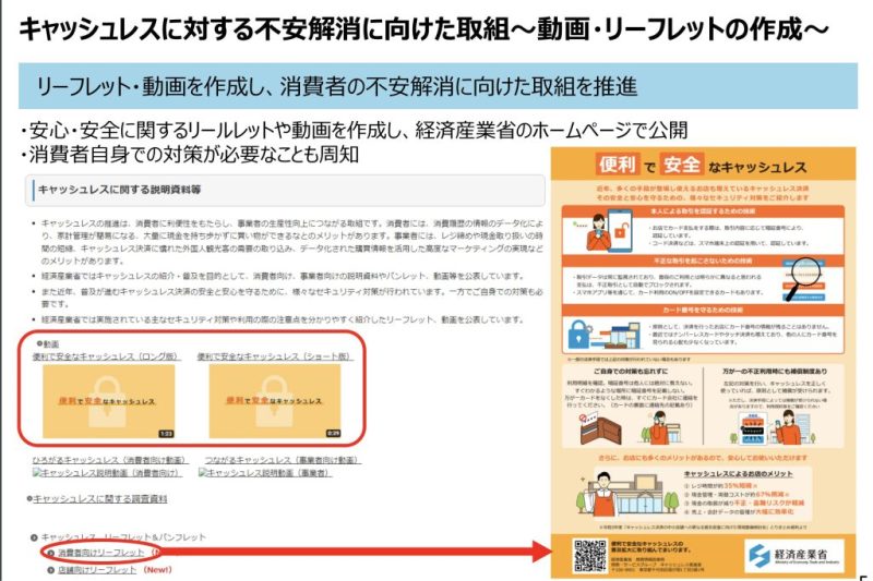 実際に経済産業省は、消費者がキャッシュレス決済を避ける「不安」を払拭するため、動画やリーフレットの制作、政府広報の活用を通じて、キャッシュレス決済の安全性や利便性をアピールしています。