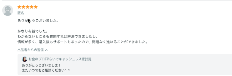 ありがとうございました。 かなり有益でした。 わからないところも質問すれば解決できましたし、 情報が多く、購入後もサポートもあったので、問題なく進めることができました。