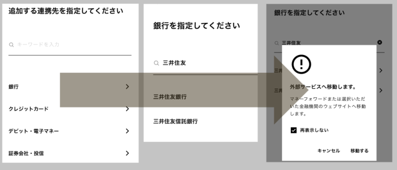 連携先の金融サービスを探し、タップすると連携先金融機関の画面に遷移します。