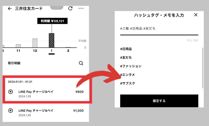 一つの明細をタップすると、ハッシュタグの設定画面に移ります。