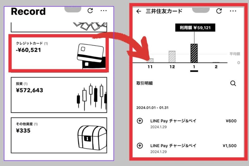 Record(レコード)の機能は金融サービスの明細を反映して、お金をの収支や残高状況を把握できる機能です。