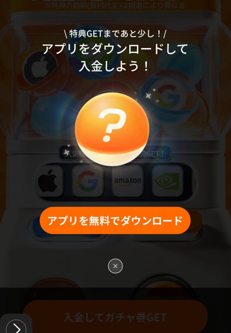 特典① (低ハードル) | 人気株ガチャ券 1枚 | 紹介専用URL経由で口座開設し、1万円以上の入金を完了する 。 |