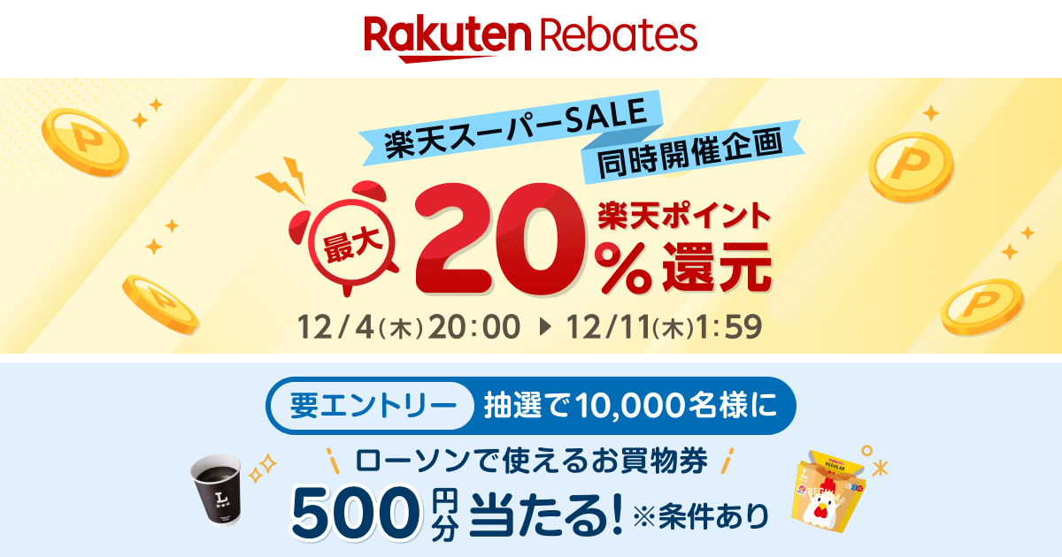 楽天スーパーSALEと同時に開催!楽天リーベイツのポイントアップキャンペーンで最大20%還元!80店以上の人気ストアが参加!さらにエントリー&アプリから1,000円(税抜)以上の購入でローソンで使えるお買物券500円分が当たるチャンス!